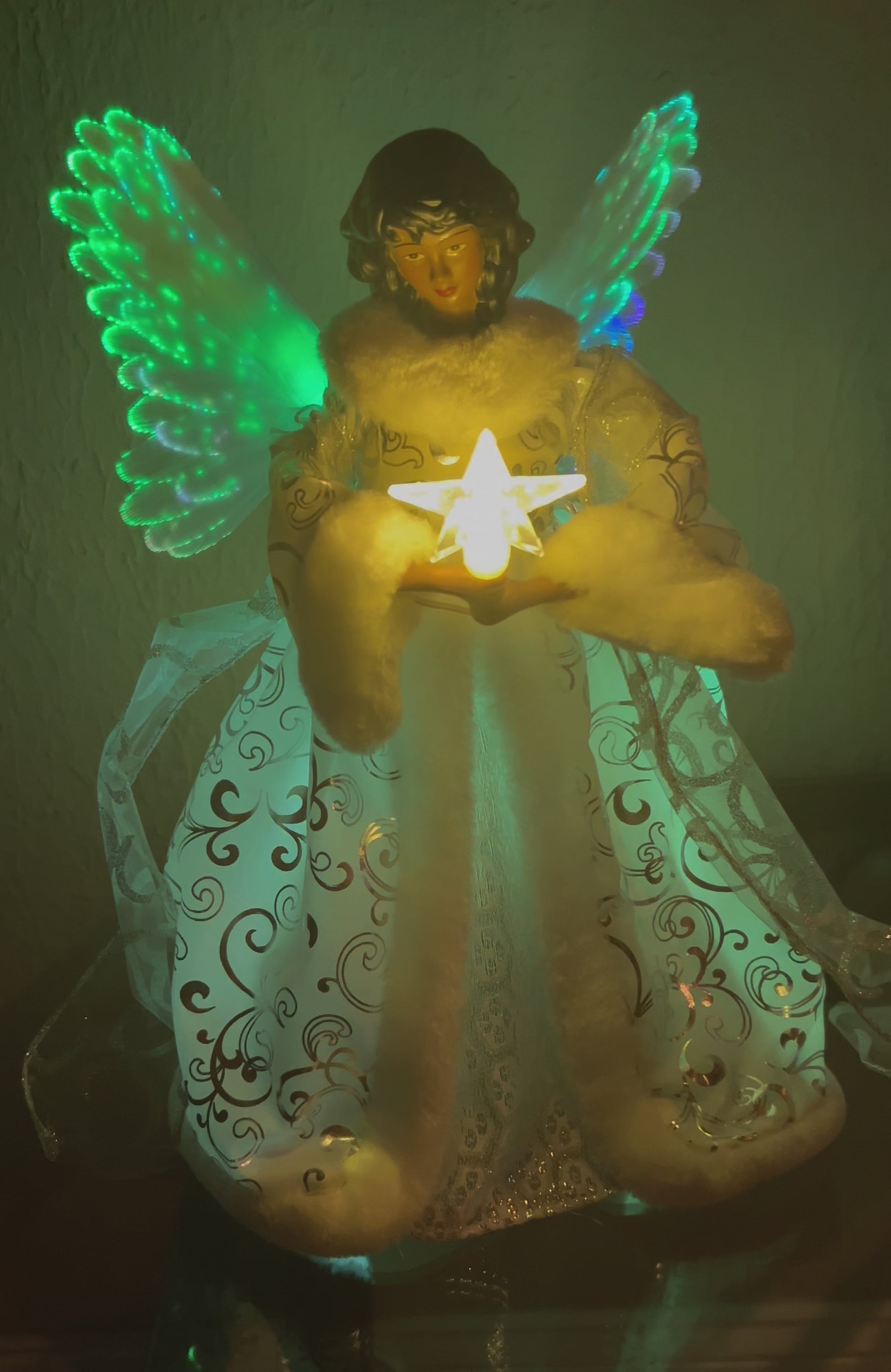 12" tall angel dressed in a flowing outfit for use as a tree topper. Angel's animated wings are illuminated by color changing lights. Ceramic head and hands with fabric outfit. Tree attachment included Adapter operated