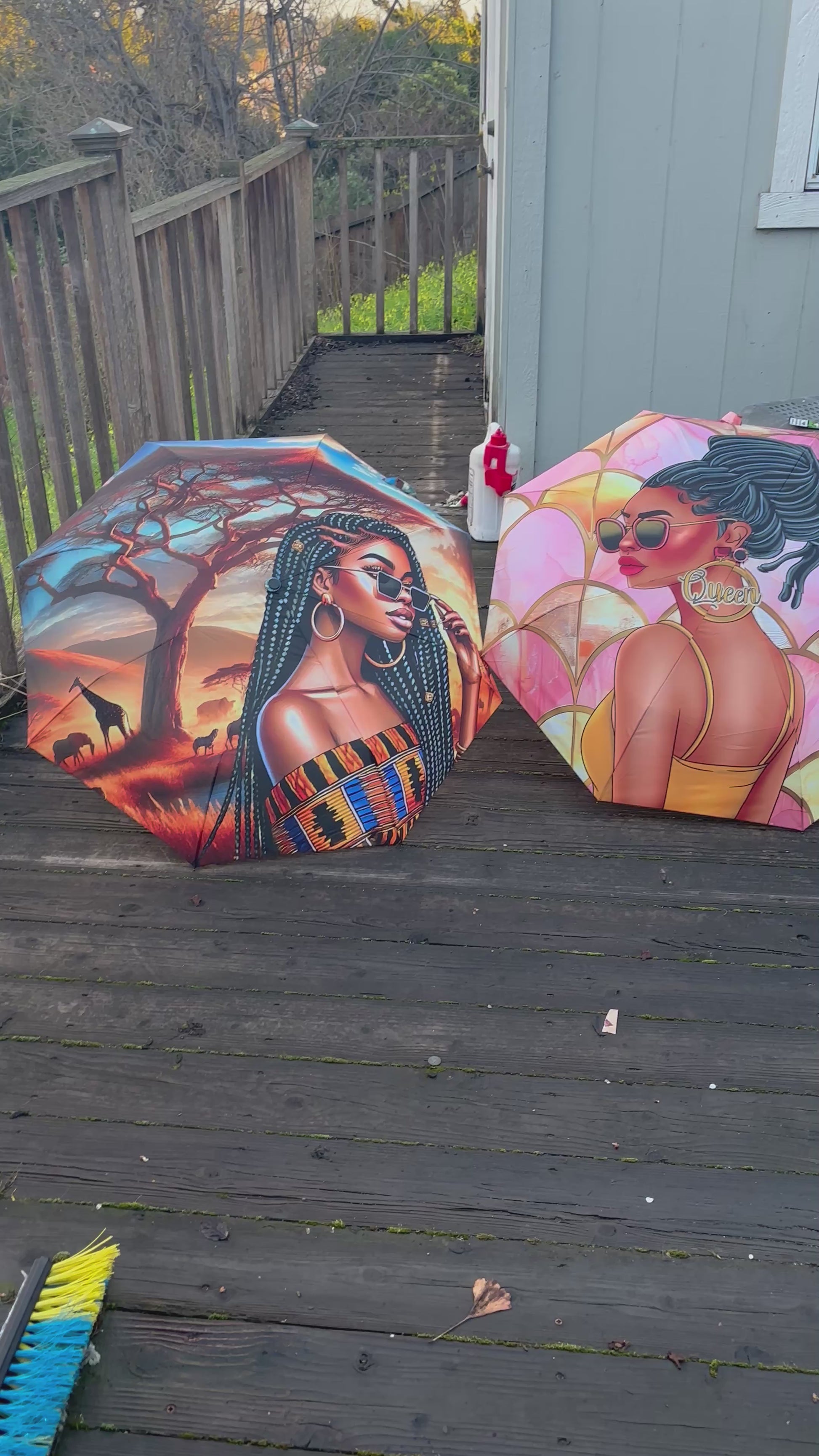 Our unique African American themed umbrellas are as beautiful as they are high quality. Folding umbrellas with matching sleeves, stylish even in a pouring rain. Steel frame for extra sturdiness. Flexible frame to enhance strength. 21 inch 8 ribs, easy open and easy close.