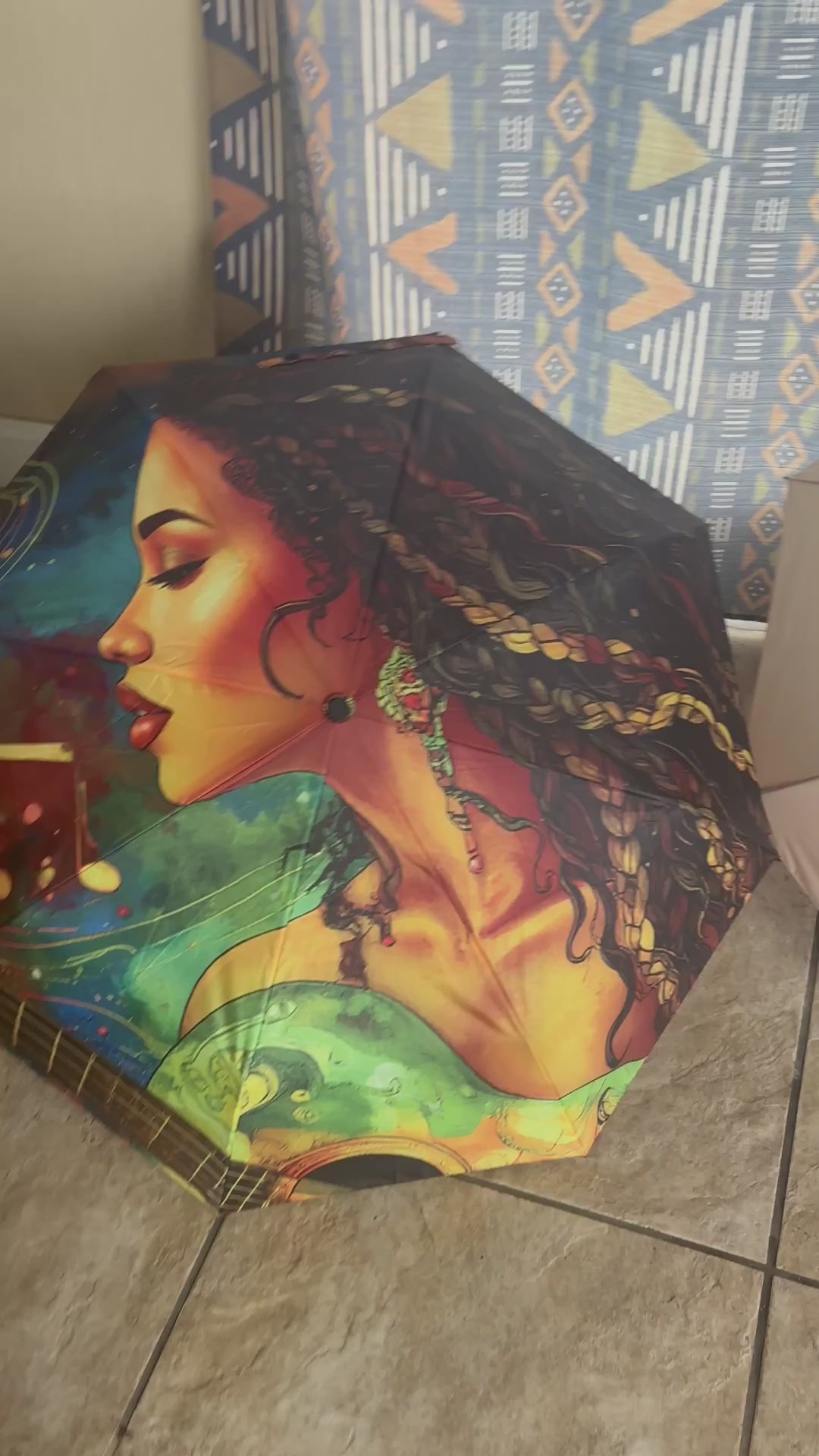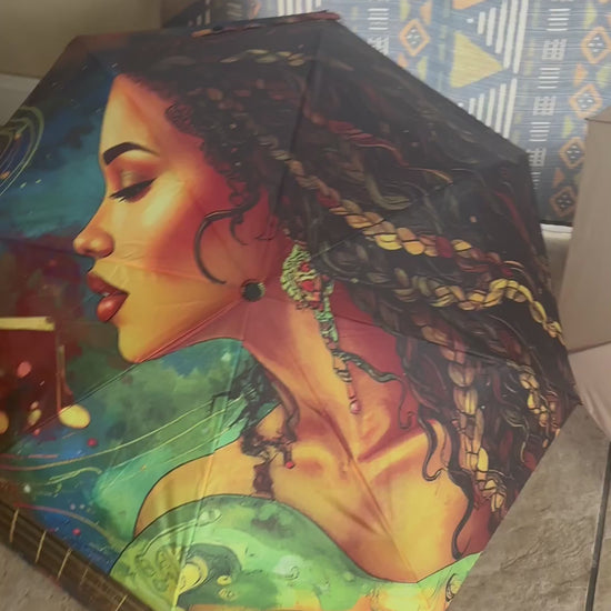 Our collection of umbrellas combines function with fierce style. Featuring Afrocentric art, vibrant colors, and empowering messages, each umbrella is a statement piece that celebrates culture and confidence—rain or shine. Whether you're blocking the sun or dancing through the rain, these umbrellas are designed to keep you covered in every sense of the word. Folding umbrellas with matching sleeves, stylish even in a pouring rain. Steel frame for extra sturdiness. Flexible frame to enhance strength. 21 inch 8 ribs, easy open and easy close.