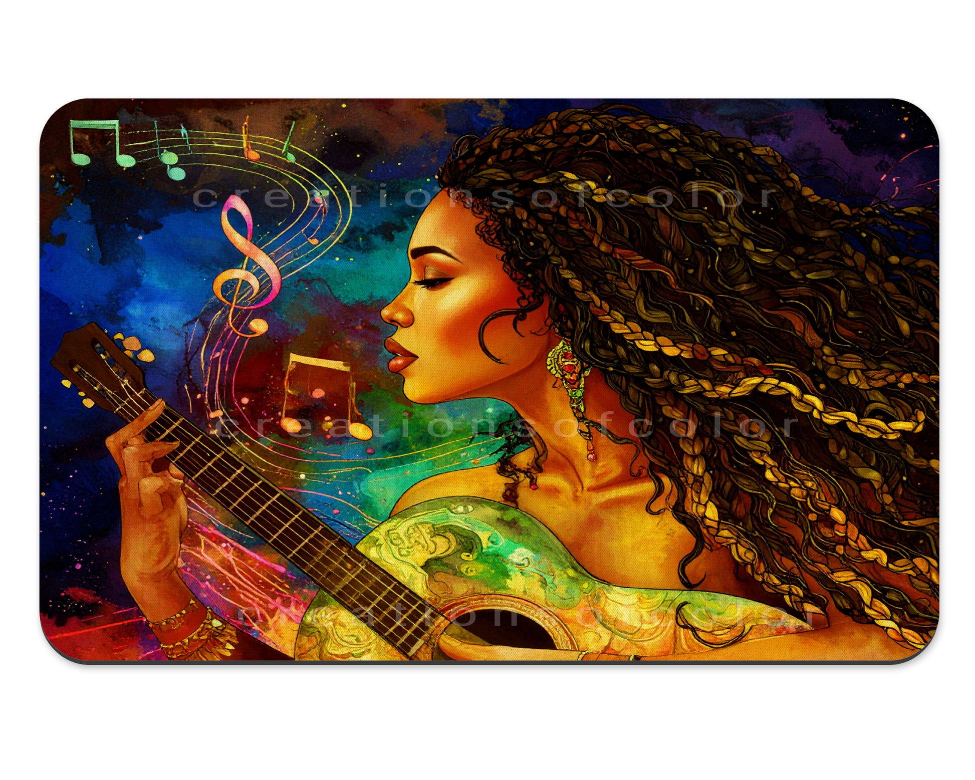 Bring the rhythm of art and music to your dining table with these vibrant Afrocentric jazz-themed placemats. Featuring a striking portrait of a beautiful African American woman in profile, her intricate braids cascading in rich gold and brown tones, she strums a delicately detailed guitar against a swirling galaxy of blues, purples, and greens. Floating musical notes dance around her, creating a soulful, melodic atmosphere perfect for music lovers and art enthusiasts.