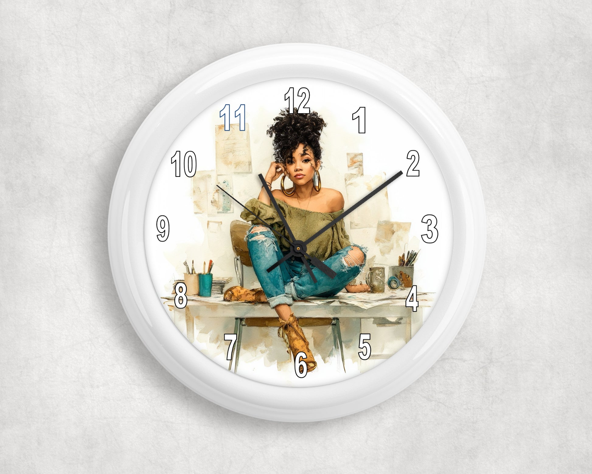 For the bold and artsy soul, the “Creative Flow” Wall Clock is a tribute to Black girl magic and everyday brilliance. Centered around a confident young woman rocking natural curls, ripped jeans, and hoop earrings, this design captures effortless style and artistic energy. With her workspace behind her and purpose in her gaze, this timepiece inspires hustle, healing, and heart.