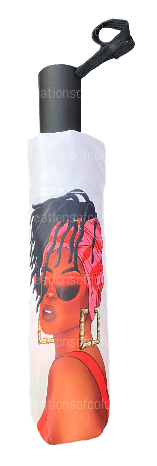Decorated with chic, contemporary black art, this stylish umbrella features a fashion illustration depicting a proud African American life. You will be sure to stand out and shine... even in the rain!