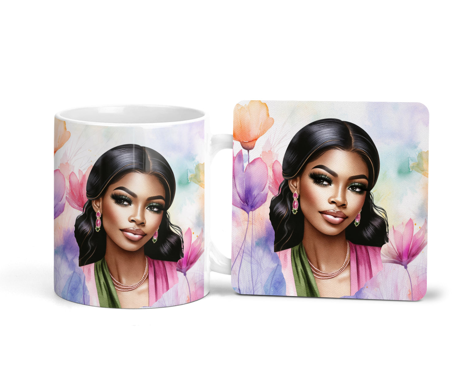 Beautiful designer mug, coasters, or set. Select either our 14 ounce mug, or our set of four coasters with stand, or one coaster. Purchase 4 Coasters and Mug as a set and save. Mug is microwave and dishwasher safe.