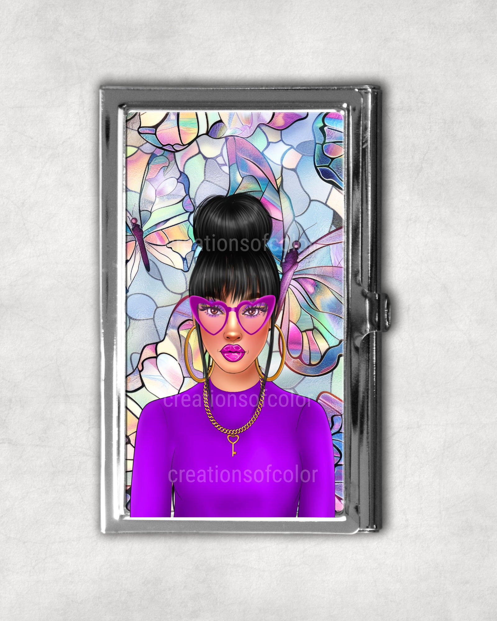 Make a bold and beautiful first impression with our Afrocentric themed business card holders. Featuring a stunning illustrations of ethnic culture elegant Black woman in purple, crowned by a background of luminous stained-glass-style butterflies, this holder is a true celebration of grace and individuality. The sleek metal case adds a touch of professionalism while showcasing your vibrant, unapologetic style.