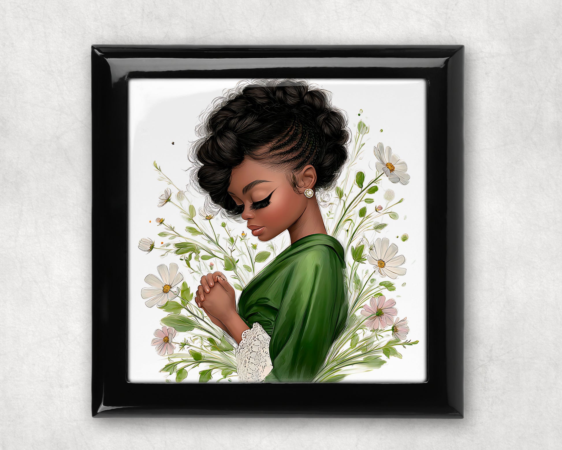 Beautiful lacquered black box with mahogany piano finish. Choose from Small Box size 5.8" x 5.8" x 2.25", or Large box size 7"x 7" x 2.5" with hinged lid and white velvet fabric lining, is the ideal elegant gift. Use for jewelry, keepsake mementos, pictures, etc.