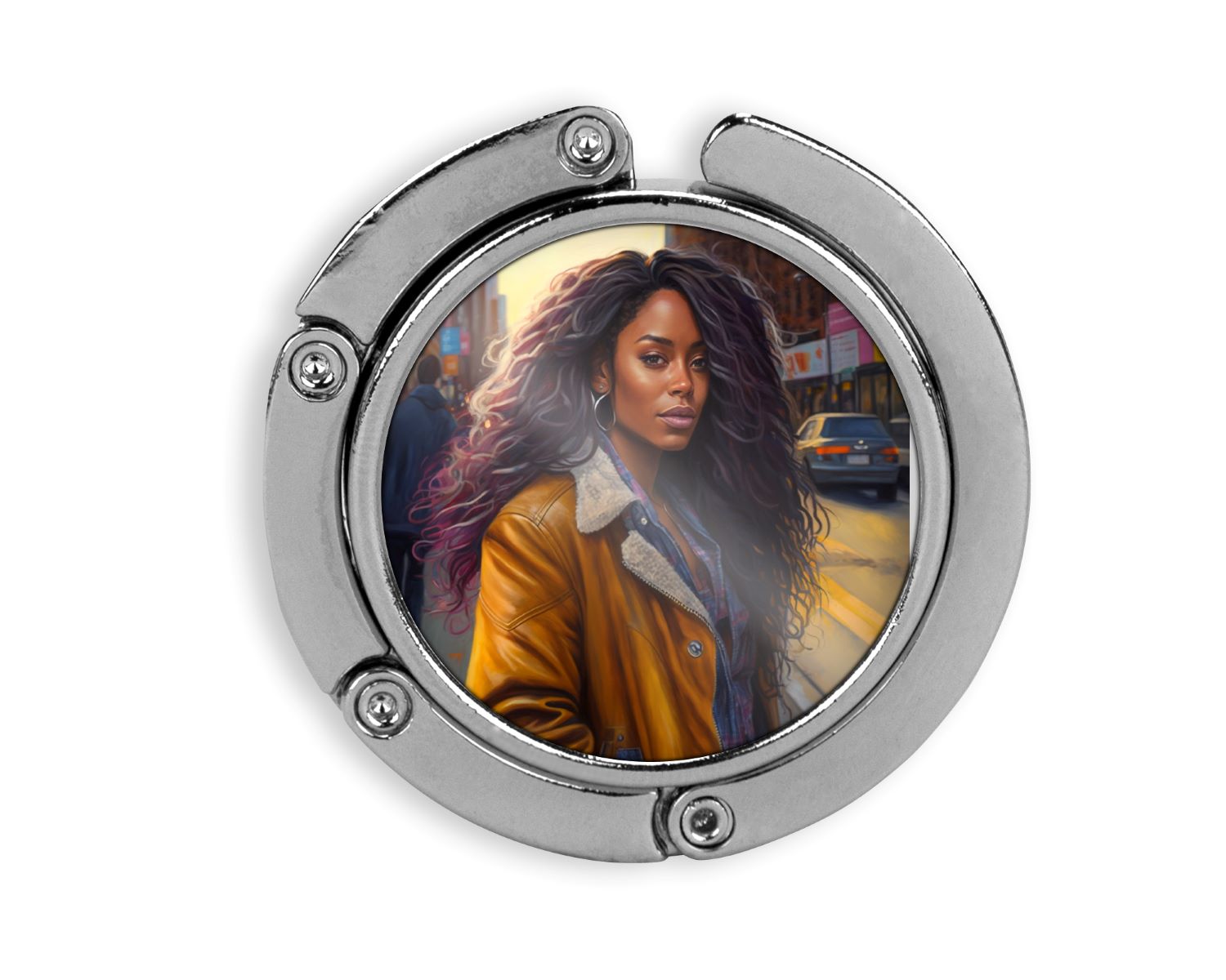 Lovely foldable purse holder, keeps your purse off the floor. A rubber base holds the hook securely on the table and an internal magnet holds the links closed when not in use. Dimensions: 2" diam.,3/8" thick, 4"L-when open. Hook Clearance: 2.25 Inch. Comes in small box.