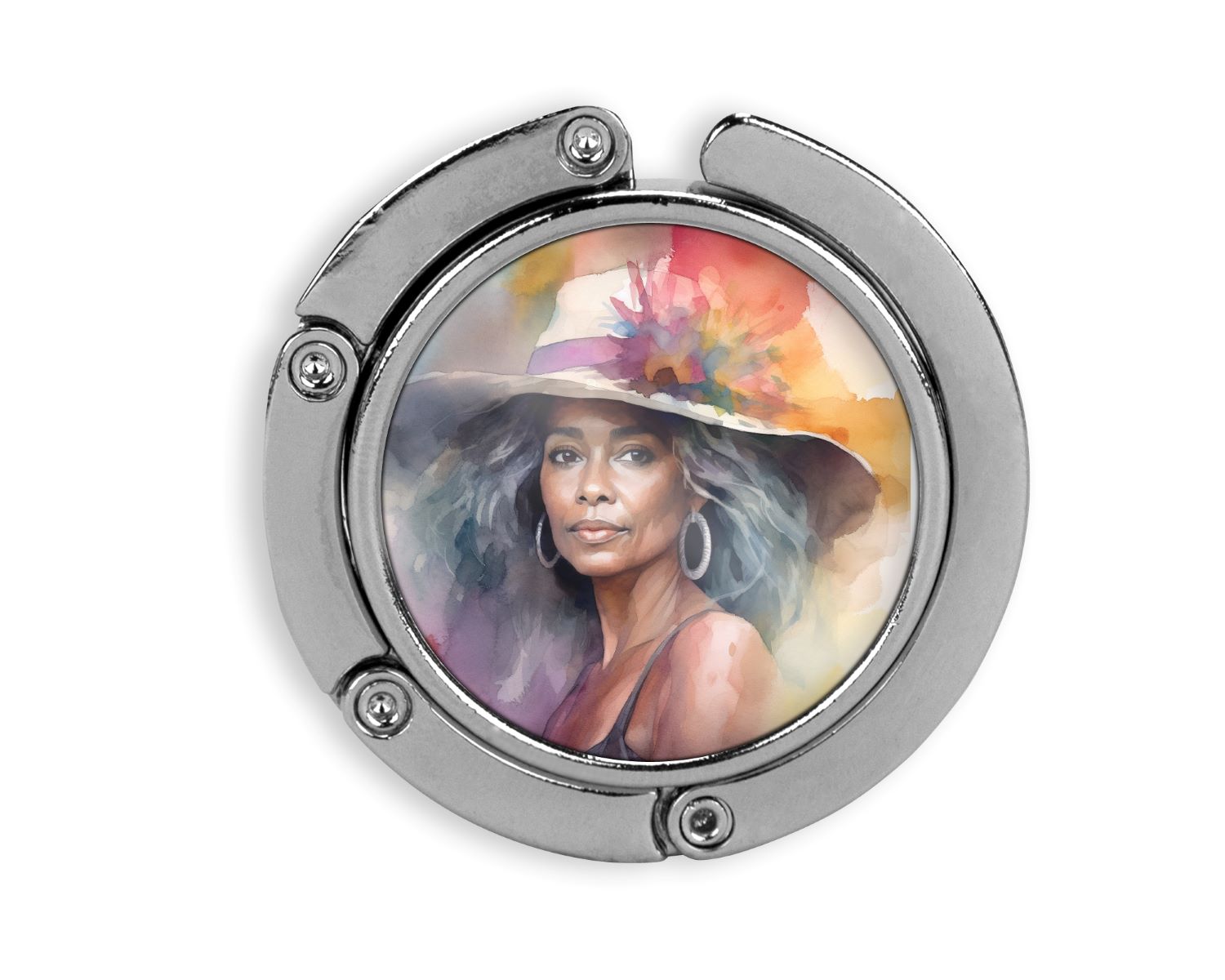 Lovely foldable purse holder, keeps your purse off the floor. A rubber base holds the hook securely on the table and an internal magnet holds the links closed when not in use. Dimensions: 2" diam.,3/8" thick, 4"L-when open. Hook Clearance: 2.25 Inch. Comes in small box.