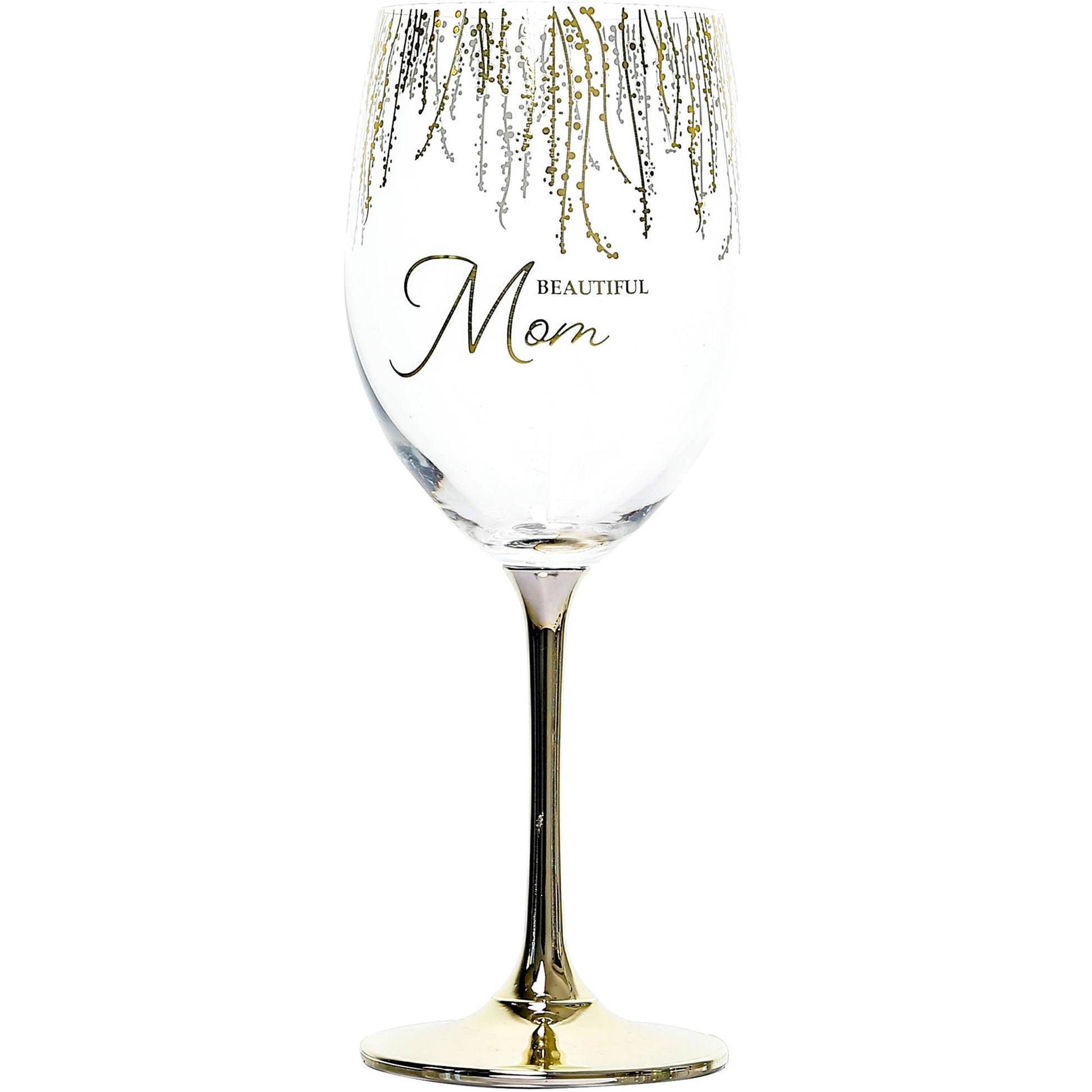 This unique 19 oz stemmed wine glass is made from crystal. This sturdy drinkware is terrific for celebratory events such as Mother's Day. . The metallic gold stem is sprayed, and the wrap-around golden floral vines hang from the rim of the glass. The "Beautiful Mom" sentiment is placed on the front side of the glass. The gift box has a "Beautiful Mom - Moms Have A Way Of Filling Our Hearts With Love. I'm So Thankful For You And Everything You Do! Cheers To You!" sentiment is heat-stamped in the bottom right. The high-quality box is cute to reuse for keepsakes or gifting another item to someone else. Soft handwash only with mild soap and the soft side of the sponge. Do not leave soaking water. Dry immediately. It's packaged in a decorative gift box and secured with a twist tie.