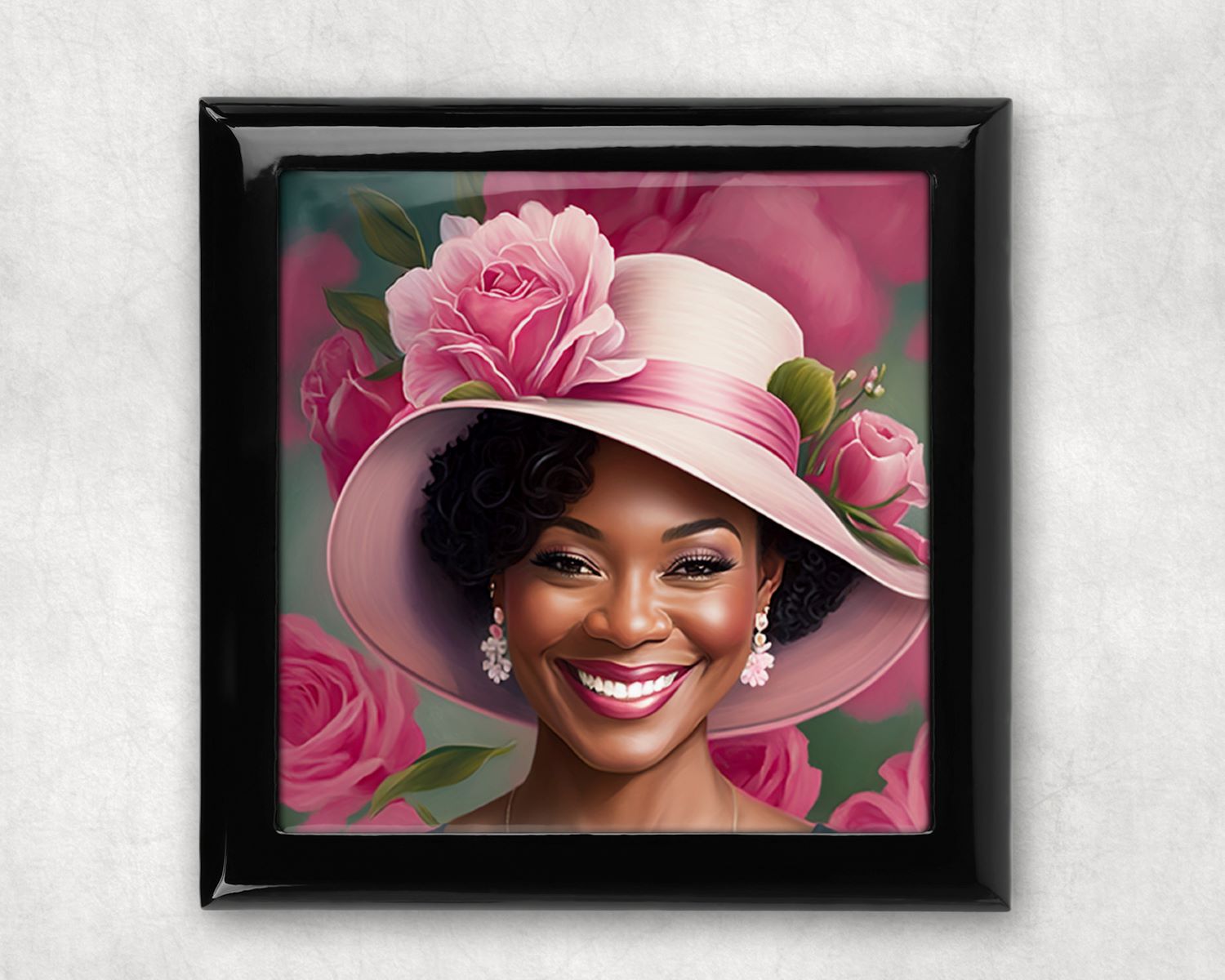Beautiful lacquered black box with mahogany piano finish. Choose from Small Box size 5.8" x 5.8" x 2.25", or Large box size 7"x 7" x 2.5" with hinged lid and white velvet fabric lining, is the ideal elegant gift. Use for jewelry, keepsake mementos, pictures, etc.