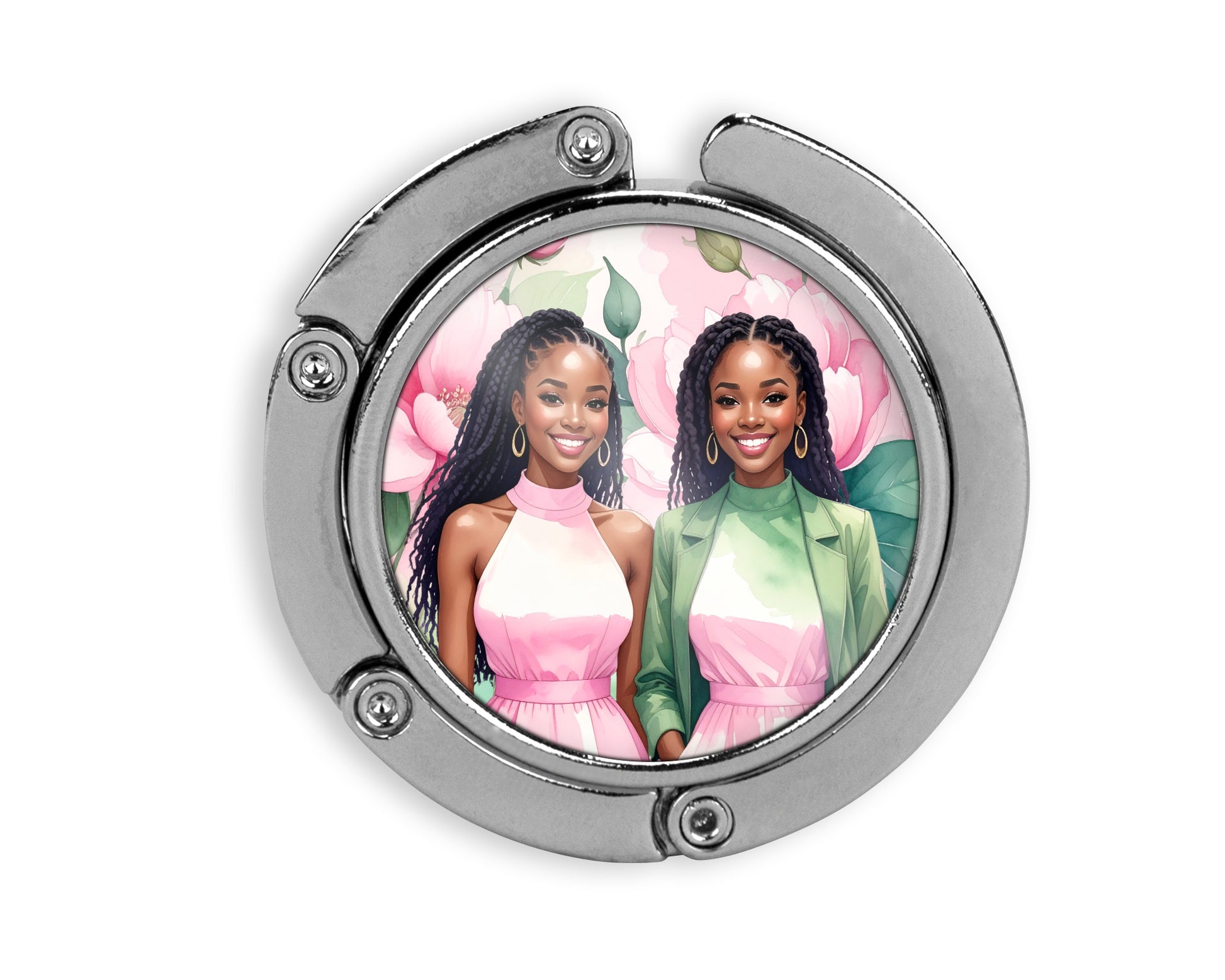 Lovely foldable purse holder, keeps your purse off the floor. A rubber base holds the hook securely on the table and an internal magnet holds the links closed when not in use. Dimensions: 2" diam.,3/8" thick, 4"L-when open. Hook Clearance: 2.25 Inch. Comes in small box.