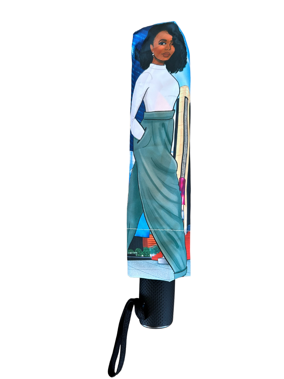 Decorated with chic, contemporary black art, this stylish umbrella features a fashion illustration depicting a proud African American life. You will be sure to stand out and shine... even in the rain!