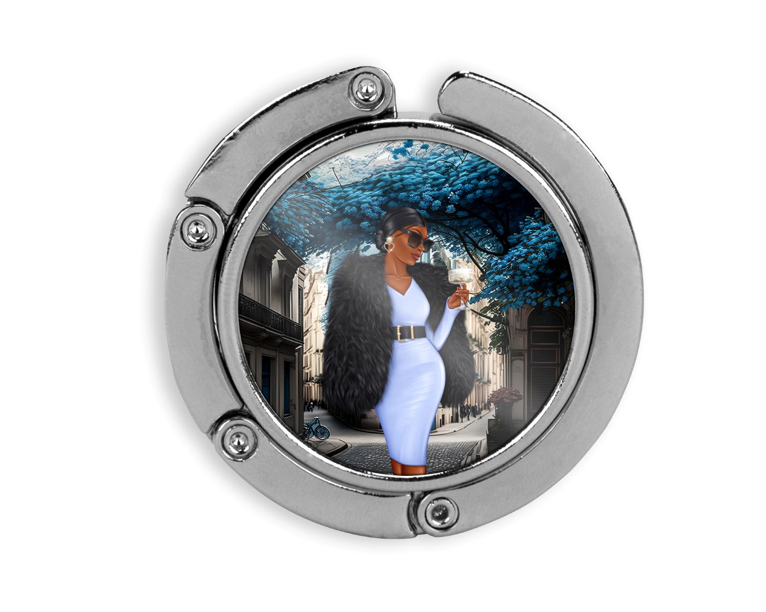 Lovely foldable purse holder, keeps your purse off the floor. A rubber base holds the hook securely on the table and an internal magnet holds the links closed when not in use. Dimensions: 2" diam.,3/8" thick, 4"L-when open. Hook Clearance: 2.25 Inch. Comes in small box.