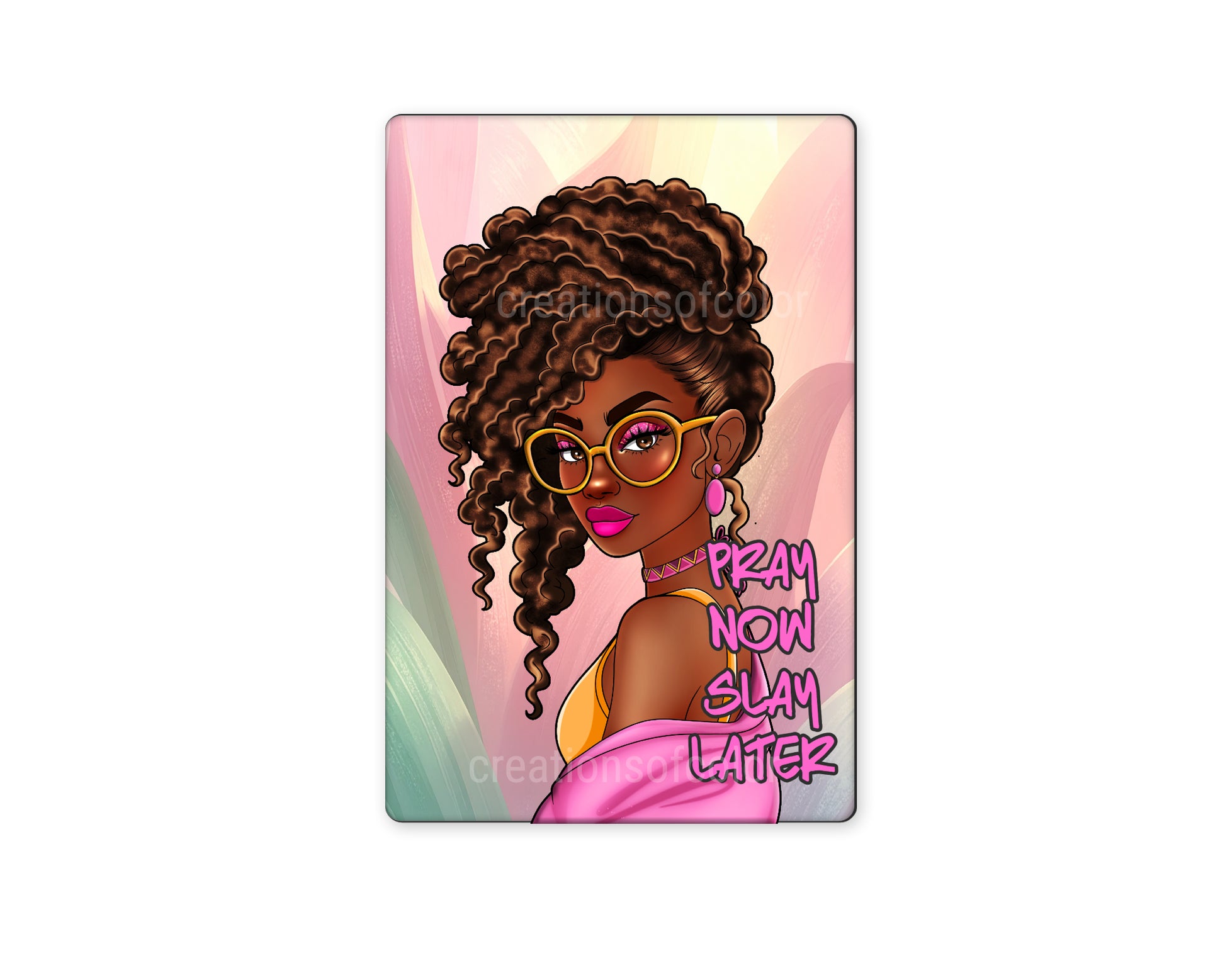 Afrocentric whimsical refrigerator magnets sized 2 x 3 inches are delightful, playful pieces that blend cultural heritage with a touch of humor and imagination. These magnets feature vibrant and lively designs, and charming illustrations of African American women. The artwork often incorporates bright colors and intricate patterns inspired by African textiles and art, creating a joyful and eye-catching aesthetic. Perfect for adding a fun and unique flair to your refrigerator, these magnets celebrate African culture in a lighthearted and whimsical way, making them a charming and meaningful addition to any home.