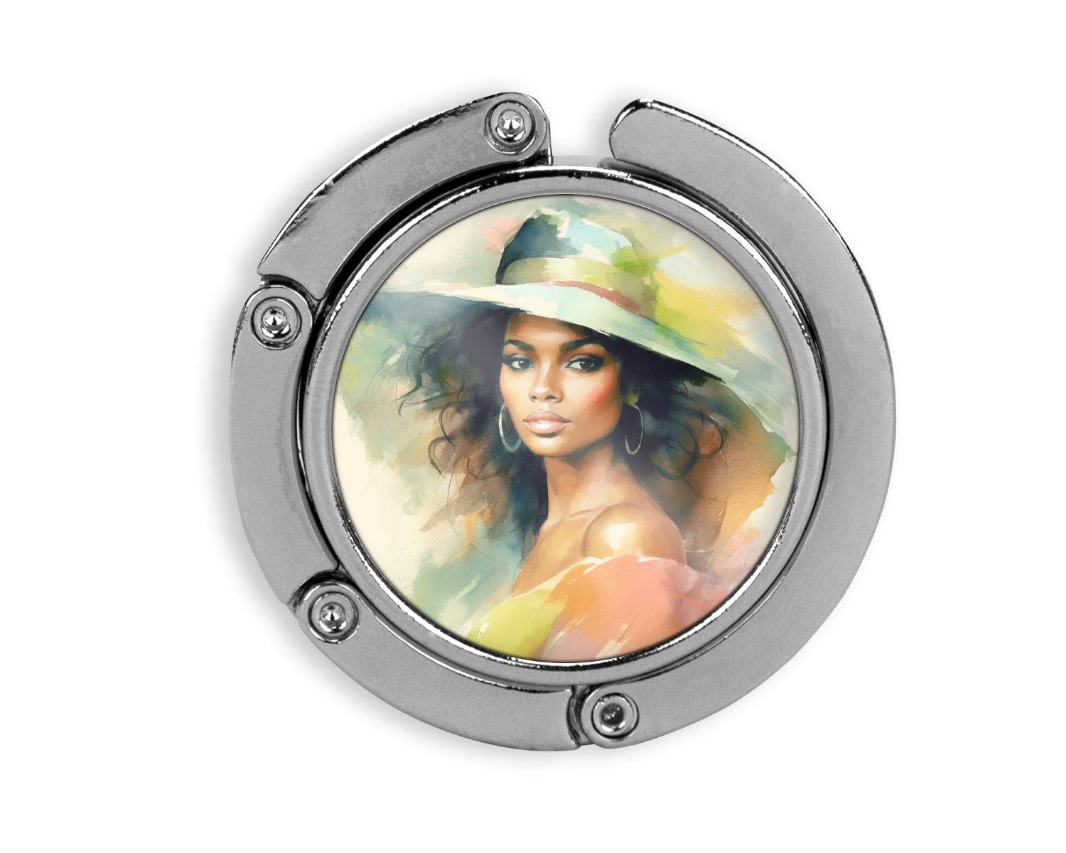 Lovely foldable purse holder, keeps your purse off the floor. A rubber base holds the hook securely on the table and an internal magnet holds the links closed when not in use. Dimensions: 2" diam.,3/8" thick, 4"L-when open. Hook Clearance: 2.25 Inch. Comes in small box.