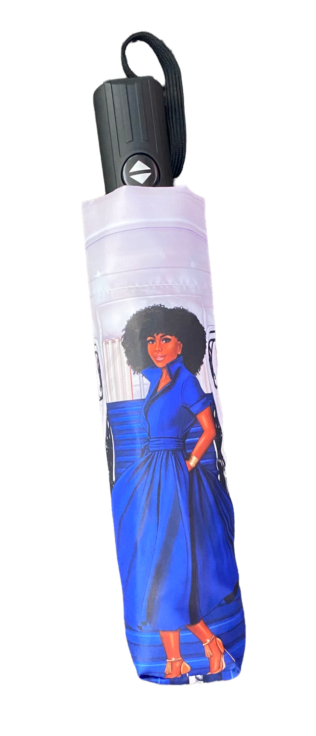 Decorated with chic, contemporary black art, this stylish umbrella features a fashion illustration depicting a proud African American life. You will be sure to stand out and shine... even in the rain!