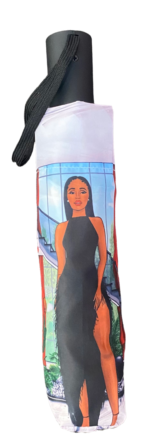 Decorated with chic, contemporary black art, this stylish umbrella features a fashion illustration depicting a proud African American life. You will be sure to stand out and shine... even in the rain!