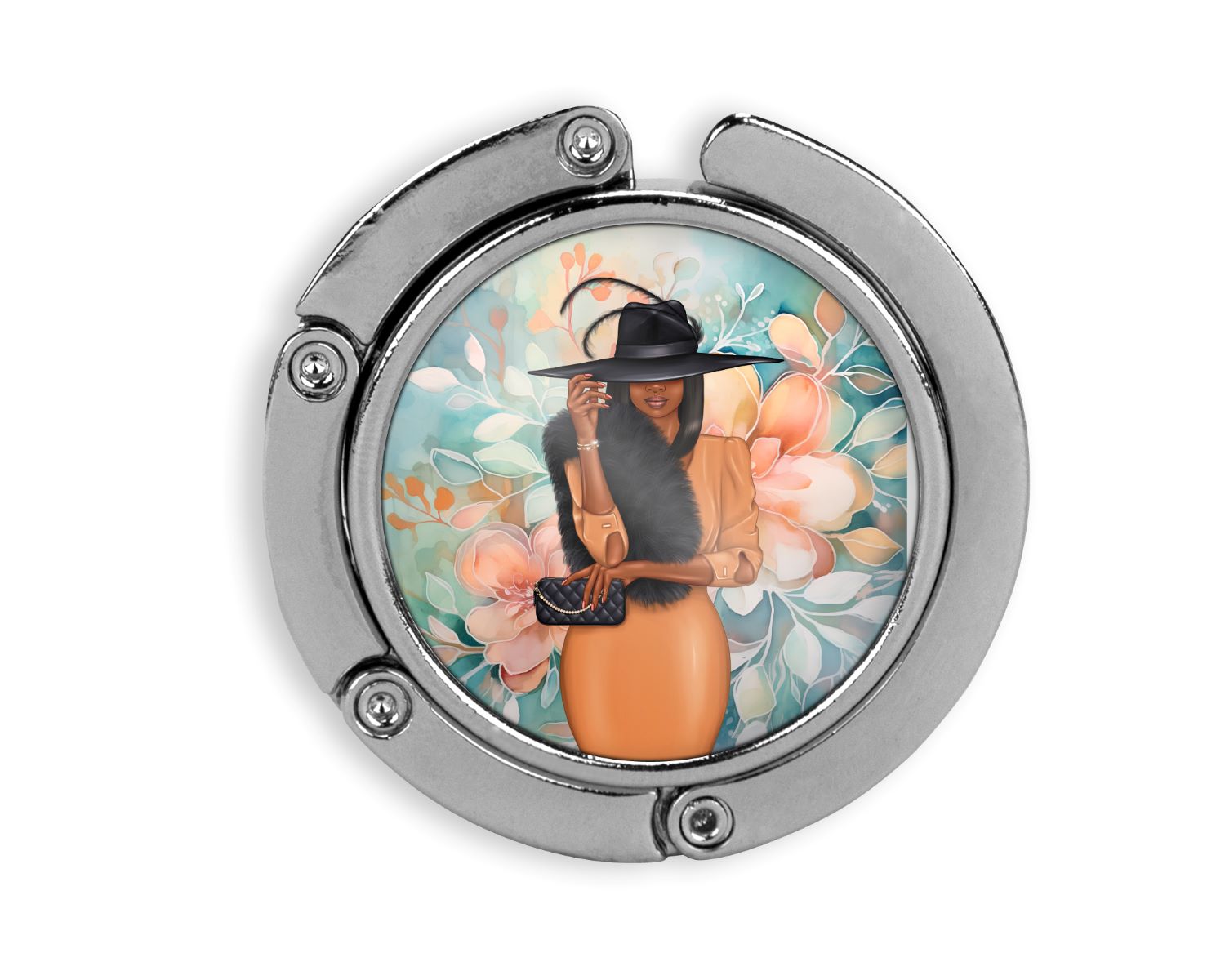Lovely foldable purse holder, keeps your purse off the floor. A rubber base holds the hook securely on the table and an internal magnet holds the links closed when not in use. Dimensions: 2" diam.,3/8" thick, 4"L-when open. Hook Clearance: 2.25 Inch. Comes in small box.