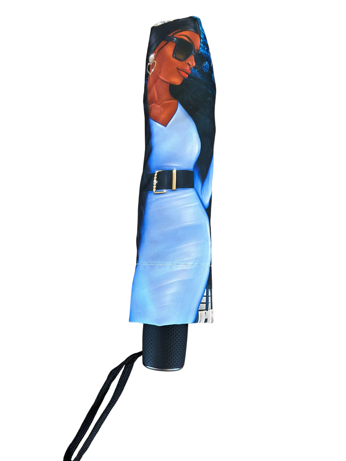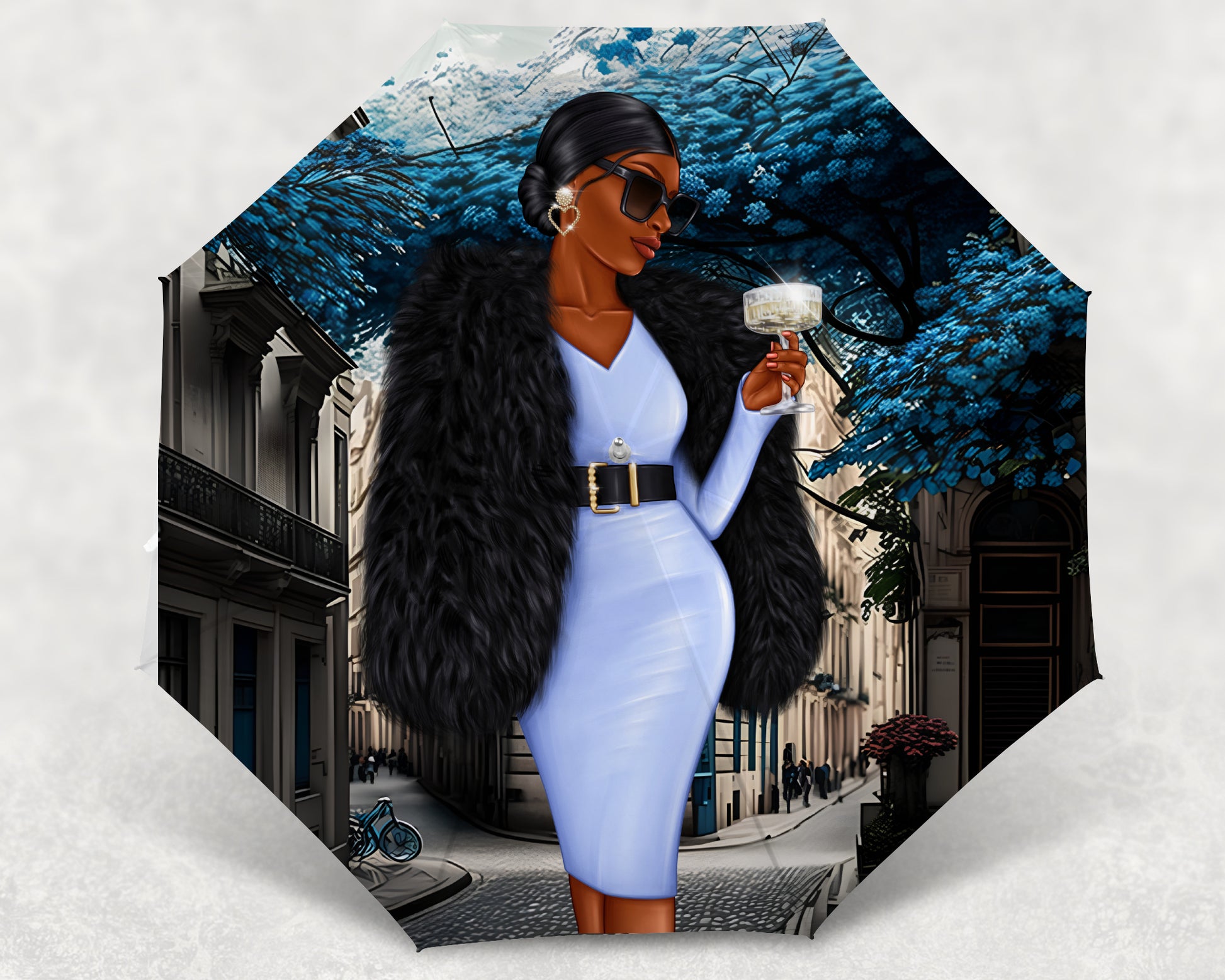 Decorated with chic, contemporary black art, this stylish umbrella features a fashion illustration depicting a proud African American life. You will be sure to stand out and shine... even in the rain!