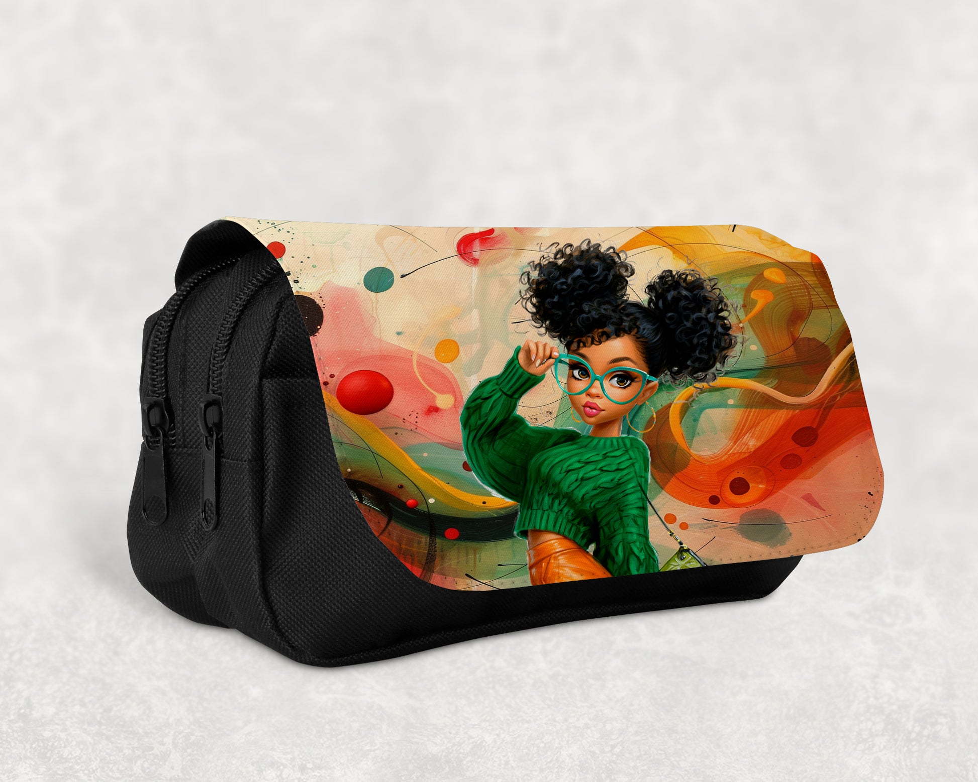 Carry a piece of culture wherever you go. This Afrocentric cosmetic bag blends functionality with heritage-inspired design. Crafted from durable black fabric with two zippered compartments, it keeps your beauty essentials neatly organized. The standout feature is the vibrant printed flap, showcasing bold artwork inspired by African and diasporic creativity. More than just a makeup bag, it’s a reflection of pride, style, and everyday elegance. Size 8.66" W x 3.44" H x 4.3" L.